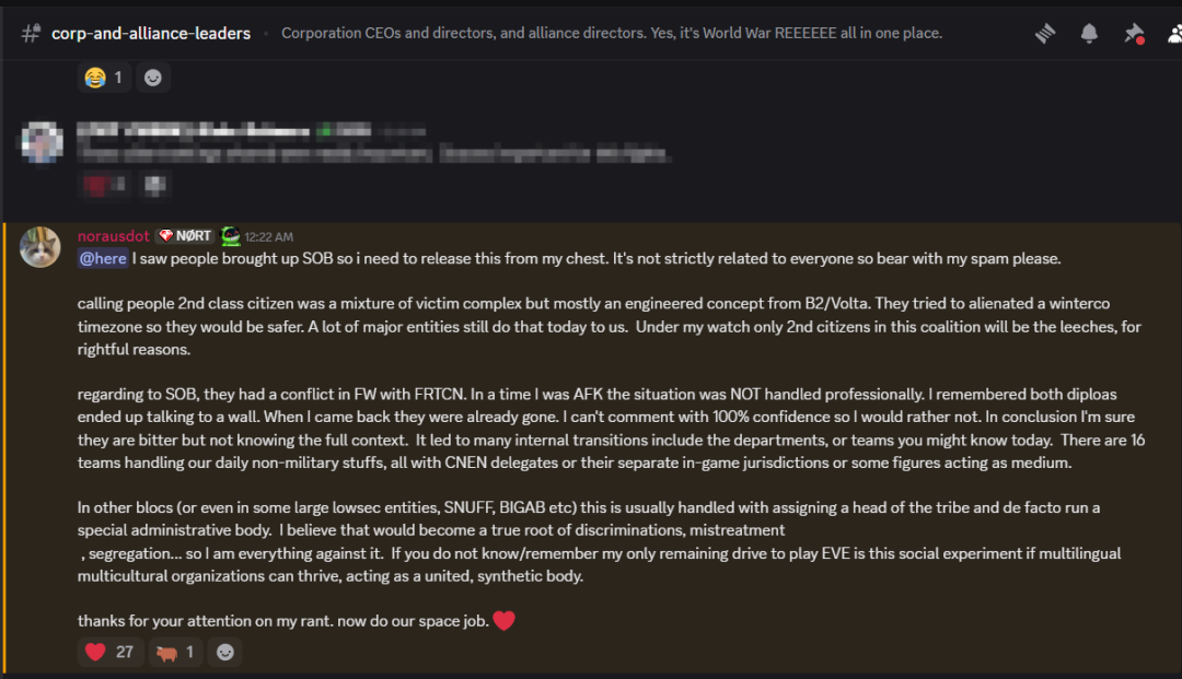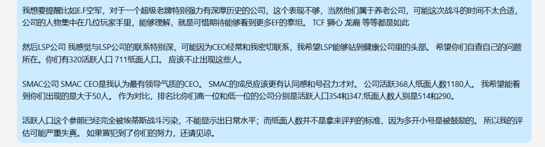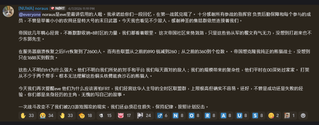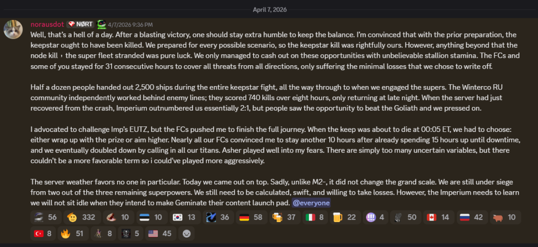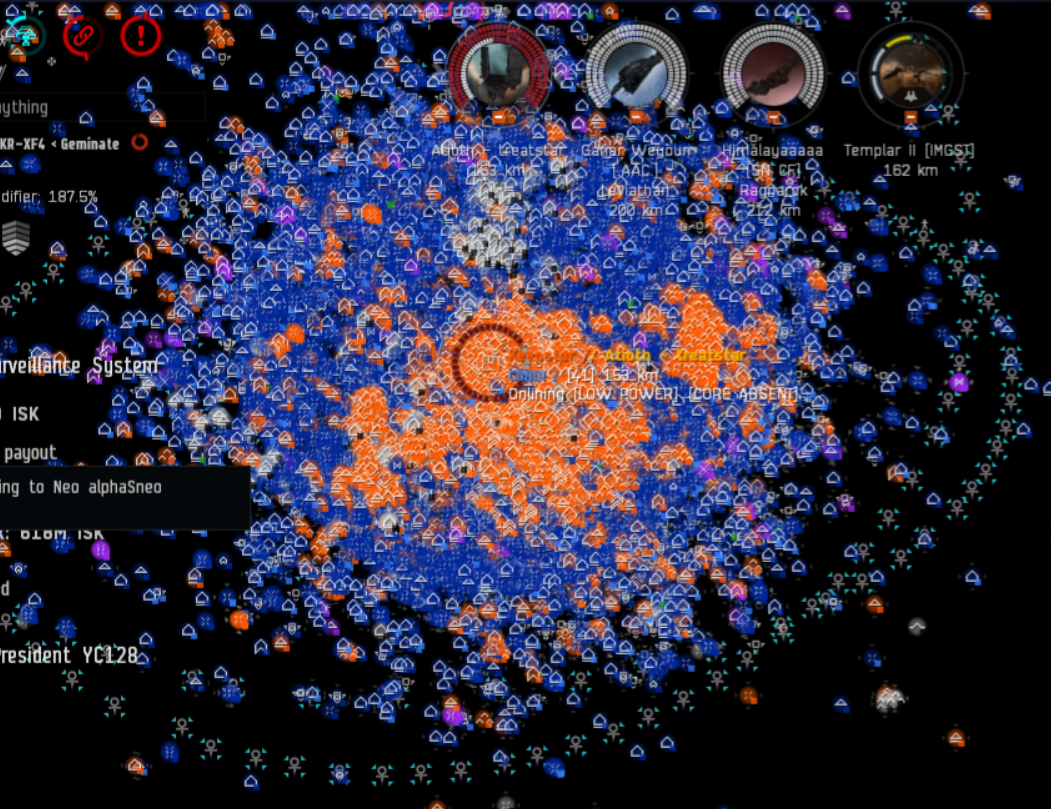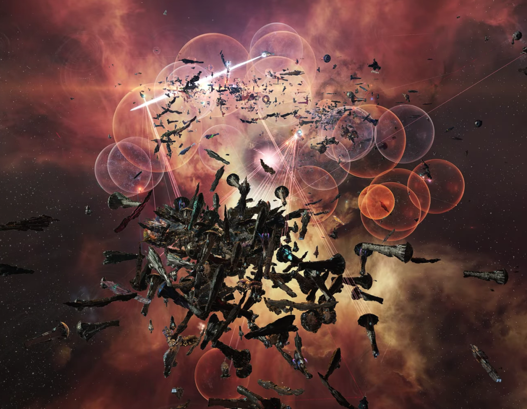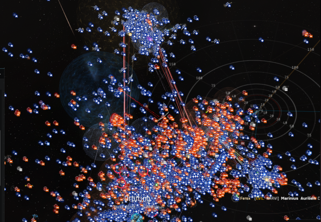 期间埃蒂斯单星系人数超过了一万人,是世界纪录。但是短暂之后节点崩溃了,所有人只能重启登录,但是只有6500人能够不稳定的,轮流的,各种奇怪事情发生的,持续这个战斗。所以这不是传统EVE的舰队战,主要还是策略和意志的比拼。 我们一些人因为要兼顾抵御INIT,连续在线超过了31小时,至少我的指挥通话持续了